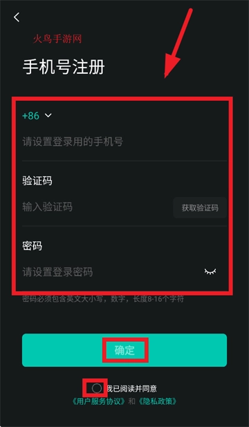 于手机号注册页面,依次填入手机号、验证码及密码,勾选“我已阅读并同意《用户服务协议》和《隐私政策》”,随后点击“确定” 。