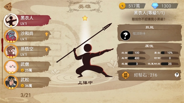 在游戏中,为玩家提供了多达数十位神话角色,其中涵盖孙悟空、猪八戒、沙僧、白娘子、法海、哪吒等。这些角色不仅在造型与所持武器方面各具特色,就连解锁方式也丰富多样,玩家能够借助金币、钻石、签到等多种途径来获取心仪角色。当对角色进行培养并提升其等级后,角色的攻击、生命等属性会得到增强,从而在实战中的表现也将得到大幅提升。