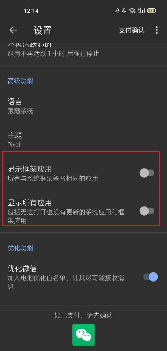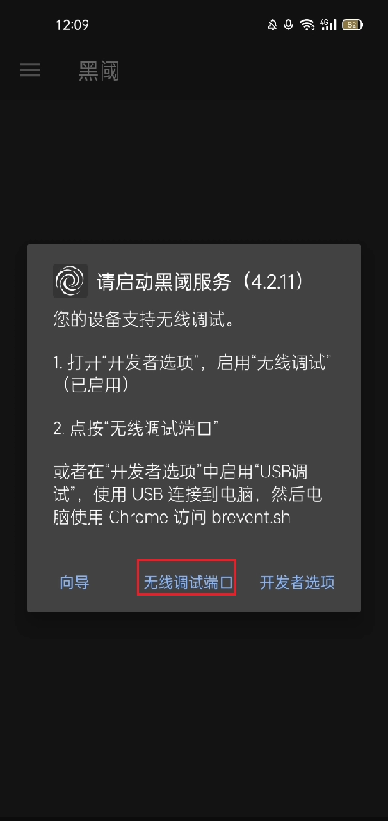 当我们进入黑阈后,会发现无线调试已成功启用。此时,点击设置,能够将显示框架应用以及显示所有应用打开。