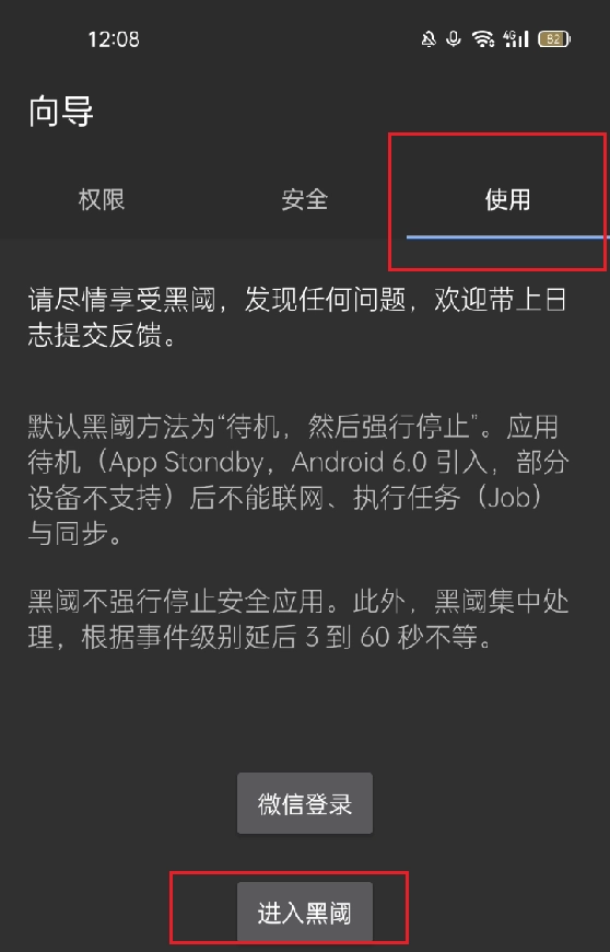 然后一直往右划,点到使用选项,点击进入黑阈。
