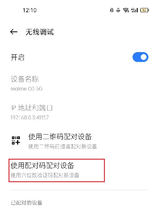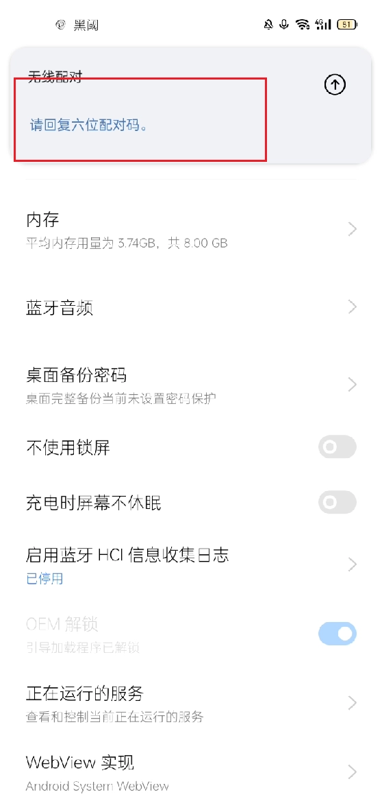 接下来,我们再次进入黑阈,找到并点击无线调试端口,进入开发者选项页面。在该页面中,点击无线调试进入下一界面,随后点击红框所指示的部分,获取六位配对码,需注意,每次点击该部分,配对码都会发生变化。获取配对码后,在通知栏弹出的对话框内输入此配对码,接着点击配对按钮,若出现“配对成功”的提示,即代表操作成功。
