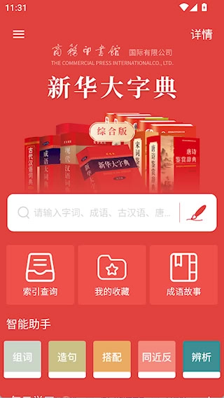 3、智能查检功能:提供单字、汉语拼音、部首等多样化检索途径。只需输入关键字或词,即可迅速检索与之相关的成语、词汇以及古诗,查词过程高效且便捷。