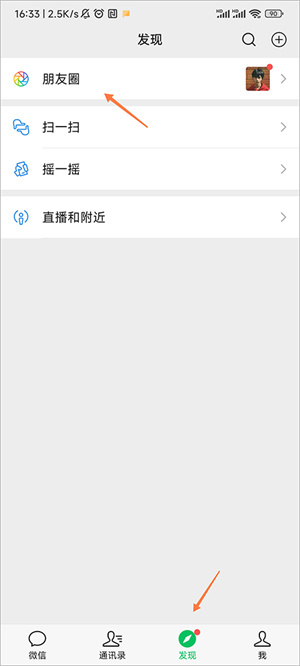 打开手机,点击微信图标,运行微信以后,在主界面底部找到并点击发现,在弹出的界面上方找到朋友圈,如下图: