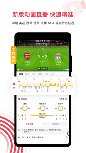 准确即时还原赛场战况的动画直播、快速精准的战报集锦,会在比分改写后及时告诉你所钟爱球队和关注比赛的比分,让你不错过每一场精彩比赛
