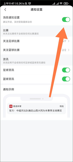 5、提醒设置:除了夜间免打扰模式,还提供个性的比赛提醒;