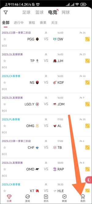 1、首先打开雷速体育,进入后点击【我的】进入个人界面。