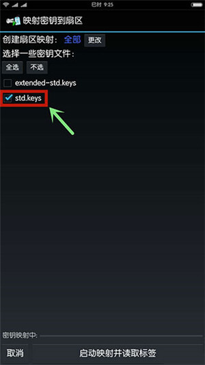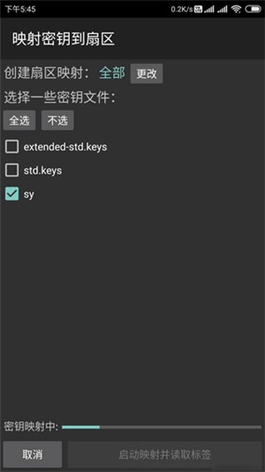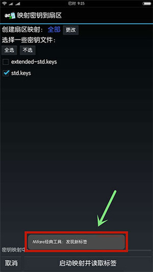 2、在MCT主界面点击“读标签”->勾选密钥文件(包含了常用的密钥)->把原卡置于手机NFC感应区,点击“启动映射并读取标签”