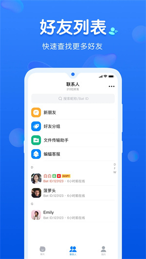 在【聊天】界面,点击右上角带【+】的图标,选择【加好友/群】,通过搜索Bat ID、手机号、昵称添加好友。