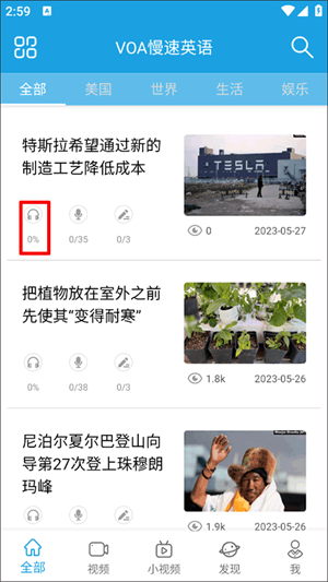 1、打开在本站下载安装好的VOA慢速英语,在“全部”界面中选择你想听的内容选择并点击红色方框内的选项;