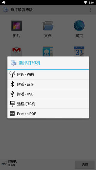 2、可通过WiFi、蓝牙、USB或互联网选择打印机;