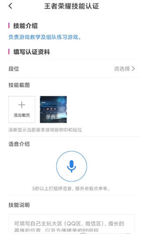 4、填写认证资料,选择段位,设置服务价格设置,上传技能截图,并上传一段自己的语音介绍(注:语音介绍必须清晰完整),填写技能说明,包括填写自己主玩大区、擅长的英雄和位置,以及方便接单的时间段。
