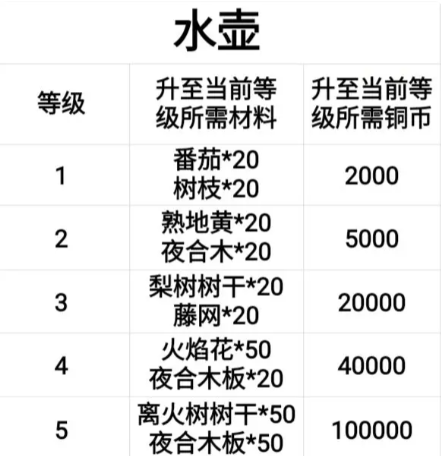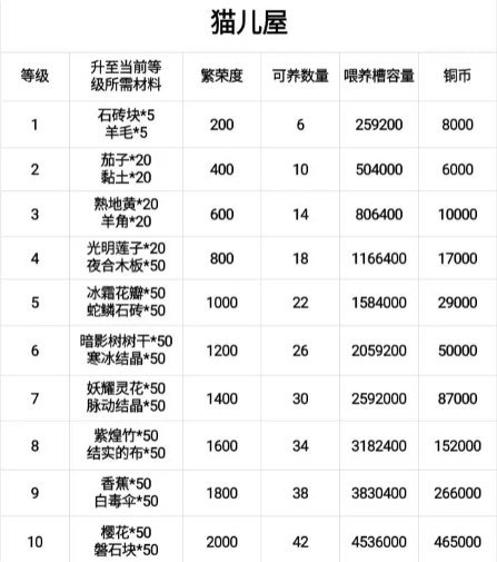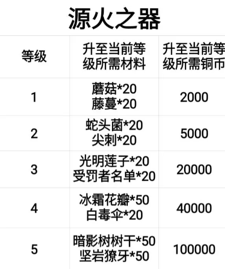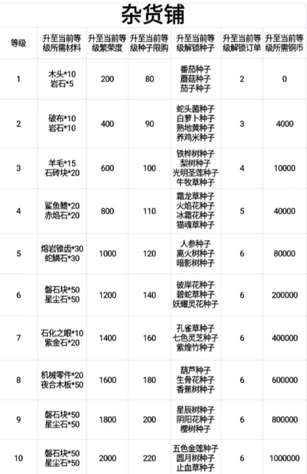 本攻略是关于魔法塔、装备锻造台、杂货铺、源火之器、水壶、鸡窝、牛棚和猫儿屋的升级所需材料、铜币数量,以及升级后的各项数据变化。