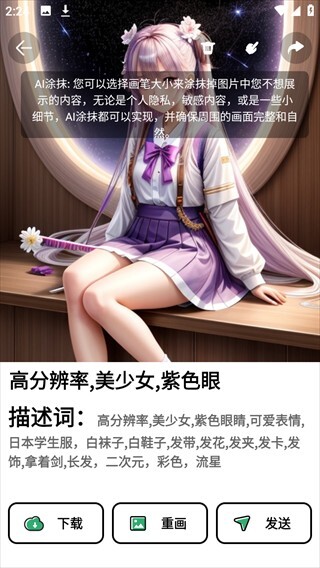 4、等待完成后就能看到ai创作画作,如下图,她就是以上描述出来的画作,是不是很神奇,可以下载至手机或是重画;