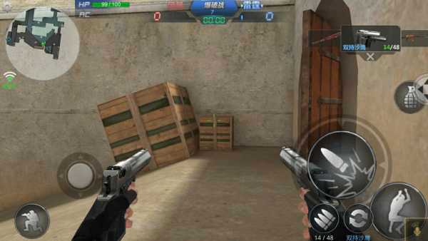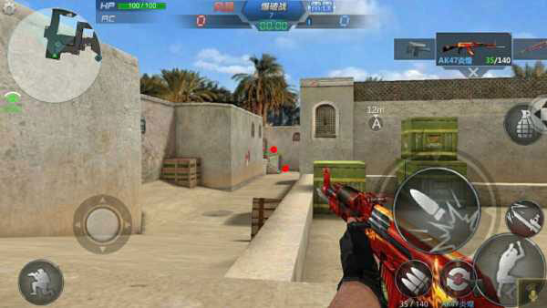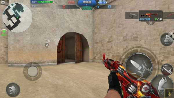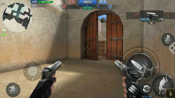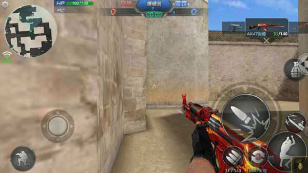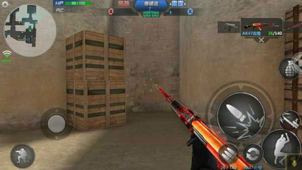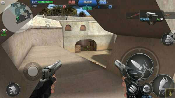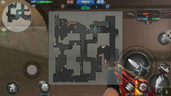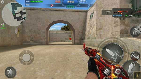 3.游戏控制游戏画面左下角有一个圆圈状的虚拟按钮,右下角有个未显示的虚拟按钮,玩家通过滑动虚拟按钮控制人物的动作。其中左下角的虚拟按钮控制移动右下角的虚拟按钮控制准星和射击。同时,在画面左上角设置按钮中有战绩查询、游戏设置、键位设置功能,左下角有蹲下按钮,画面右侧分布有跳跃、切换武器、换子弹、扔手雷等按钮。