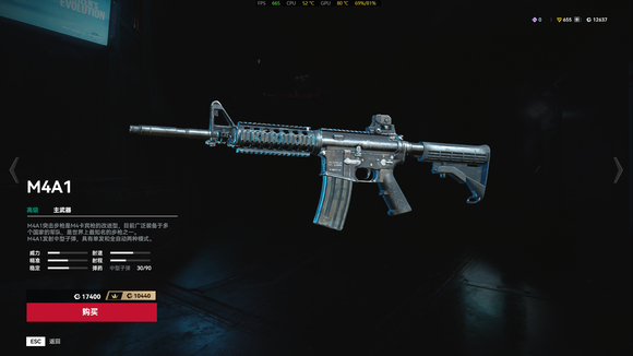 第三把推荐步枪是M4,M4在游戏里算得上是非常中规中矩,威力一般,射速快,射程较短,属性非常的全面,很适合萌新用来过度的一把枪。