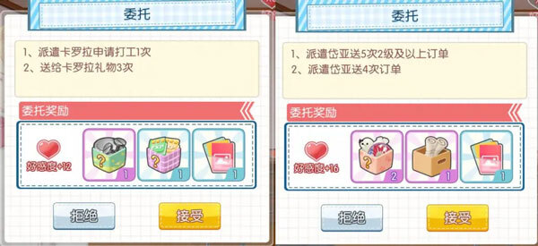 游戏内每日都会刷新一波店员委托任务,每天可以接收5个委托任务,可以到店员房间养成界面查看,或者在店内店员头顶弹出叹号气泡时点击接收;