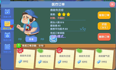 玩家等级达到10级以后就可以通过点击医院门口宣传栏接医疗订单任务,如果你医术值足够高,建议接难度5星订单特别是医疗订单中的成长订单,如果不是5星订单你可以通过删除订单刷新订单