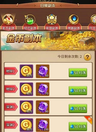 金币副本,如果每天只免费扫荡2次的话能获得100万金币,但不建议用钻石扫荡;