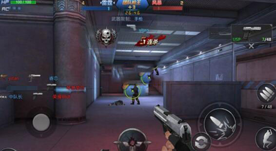 手枪,用手枪的时候就是冲,这是东东战斗时惯用的战术,手枪近战威力还是比较足的,不过玩家们也要懂得利用障碍物的掩护。