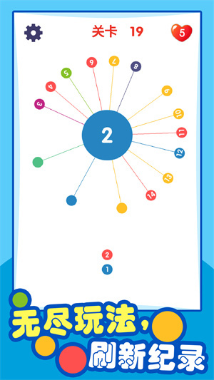 1、见缝插针:看准再插哦,轻触屏幕,像扔飞镖一样将数字小球发射到旋转齿轮上,直到小球全部用完,并且不能碰到其他小球即算成功过关。