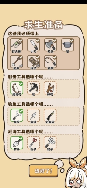 1. 开局选择:简易弓、鱼叉、铲子,然后进入游戏。