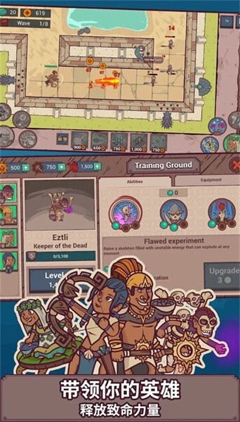 - 召集各种不同类型的英雄,他们都有独特技能,帮助你守卫圣殿,抵抗入侵。