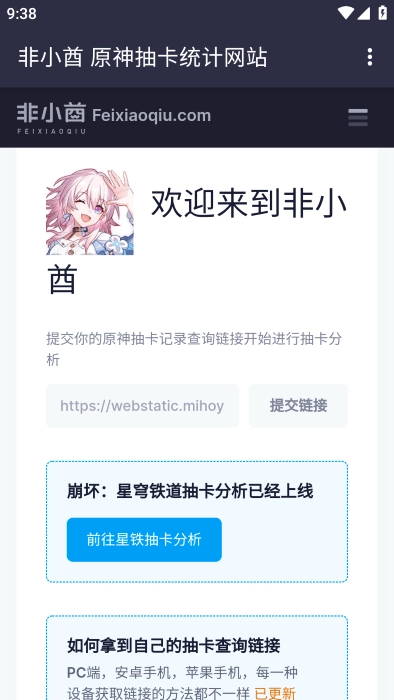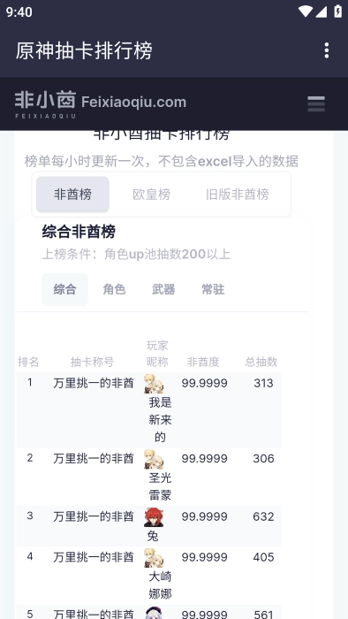 非小酋最新版支持直接上传抽卡记录并进行分析,它同时也是一个能保存原神抽卡记录并完成抽卡分析的网站,还可对上传的数据进行管理,比如设置权限、修改昵称、导入导出、修改及删除等操作。