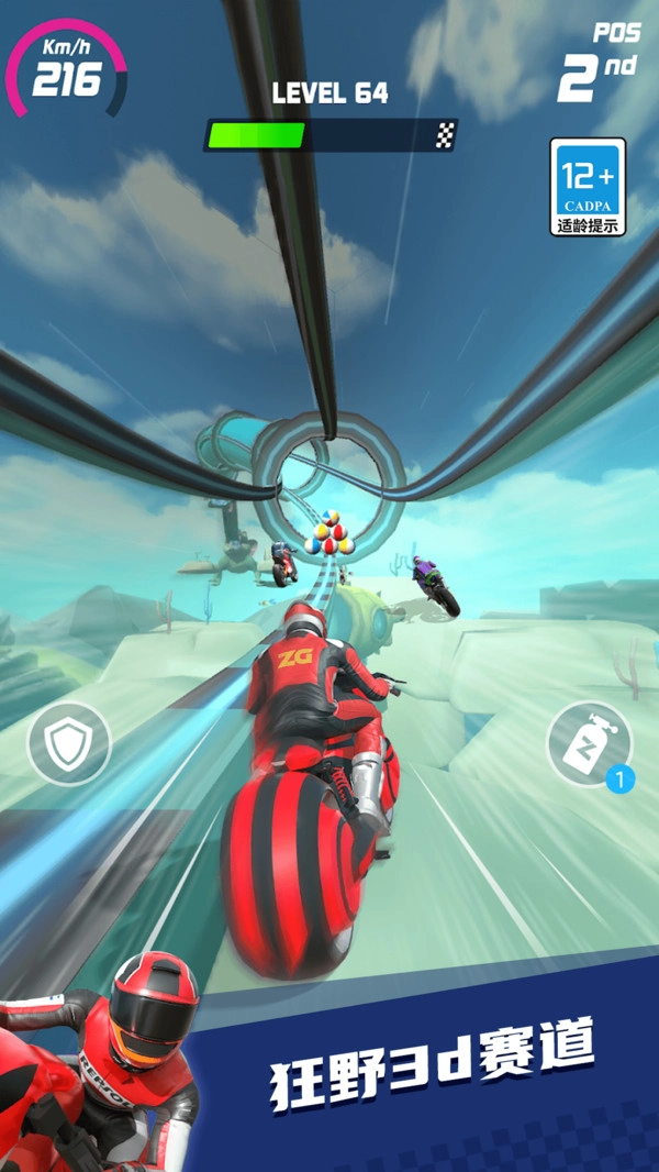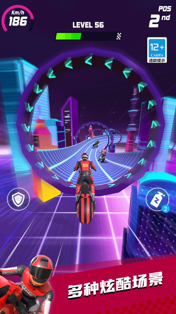 1.使用加速道具图标可瞬间提升摩托速度,在直线赛道或超车关键时刻能快速拉开距离获取优势。