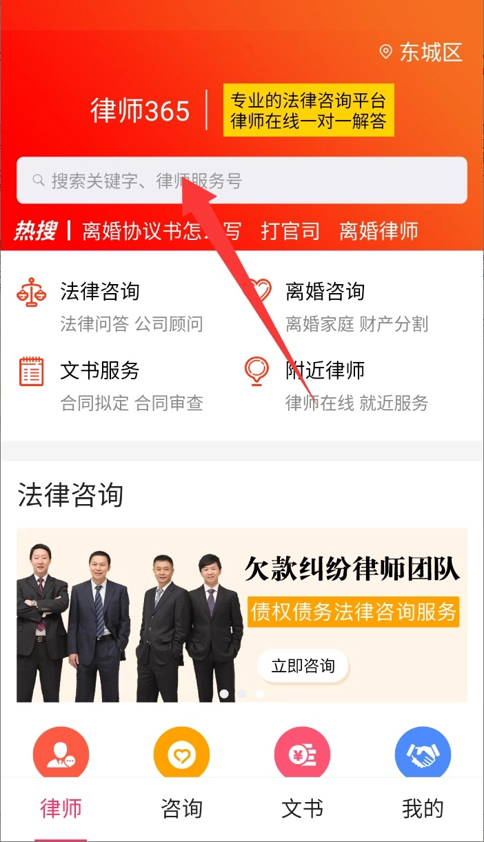 2、于首页顶部的搜索栏,能够借助输入关键词或者律师编号,快速寻找到所需的法律服务。