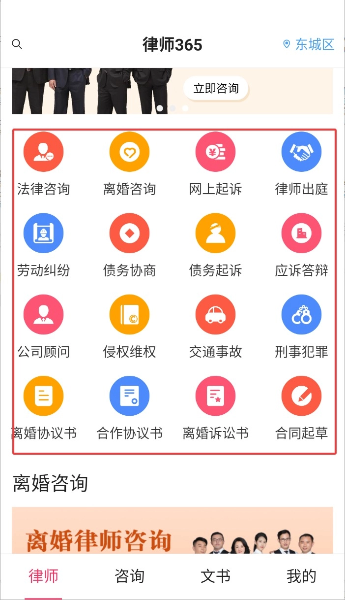 3、在页面的下方,专门设置了法律咨询、案件办理等功能专区,用户能够依据自身需求,挑选与之对应的服务。
