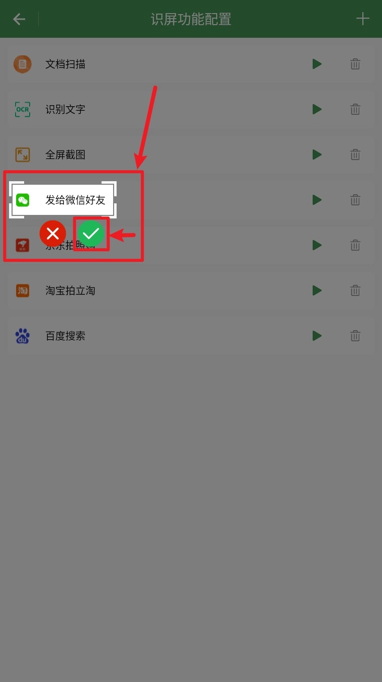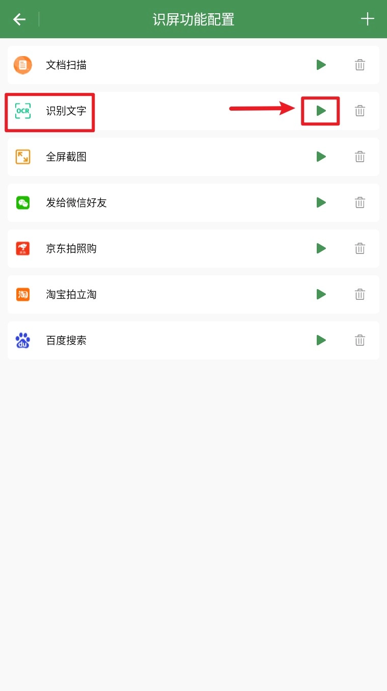 2. 点击“配置屏幕识别功能”,能够选择诸如识别文字、截图、扫码、发送微信等操作方式。