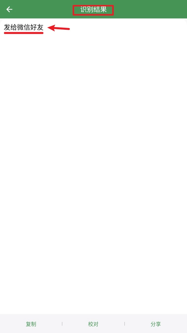 4. 内容成功识别后,会自动展示在结果页面,用户能够进行复制、校对操作,也可分享至微信等平台。