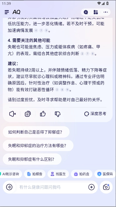 AQ提供专业的健康管理服务,让用户能更便捷地在线借助AI进行健康问诊,享受优质的健康服务。同时,助力用户更高效地在线咨询健康问题,带来贴心便捷的健康管理体验。在这里,用户可以更好地记录自身健康状况,创建专属电子健康档案,还能获取科学的健康建议。