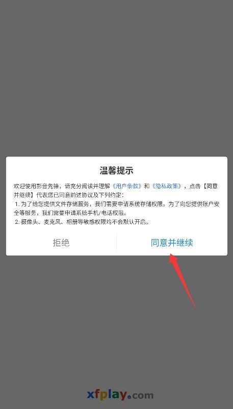 1、初次使用需阅读平台服务条款与隐私政策,确认后点击同意并继续进入应用。