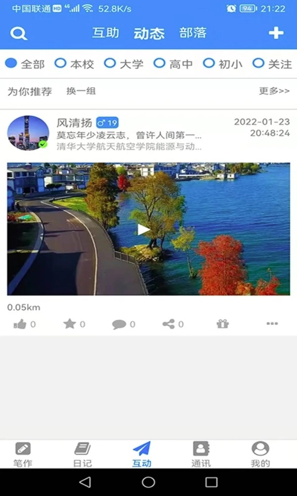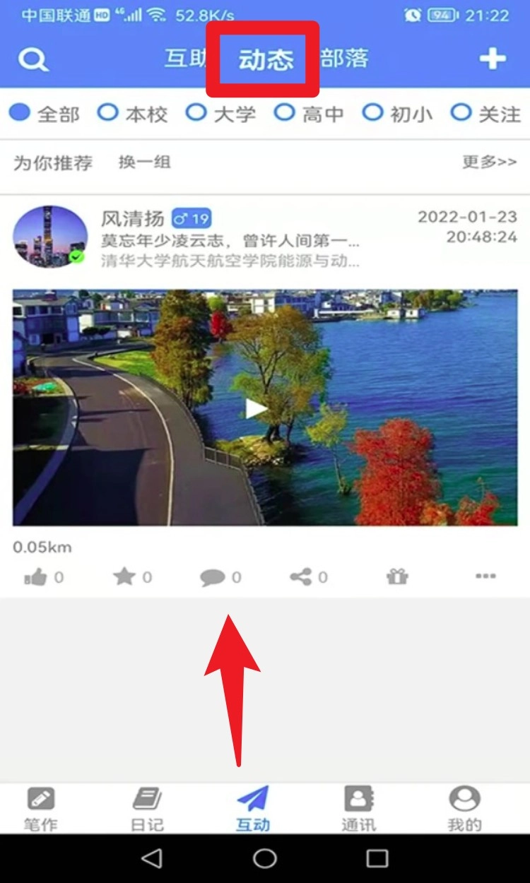 3. 点击底部菜单栏里的「互动」板块,就能查看同城或校园发布的交友、提问、求助等丰富内容。