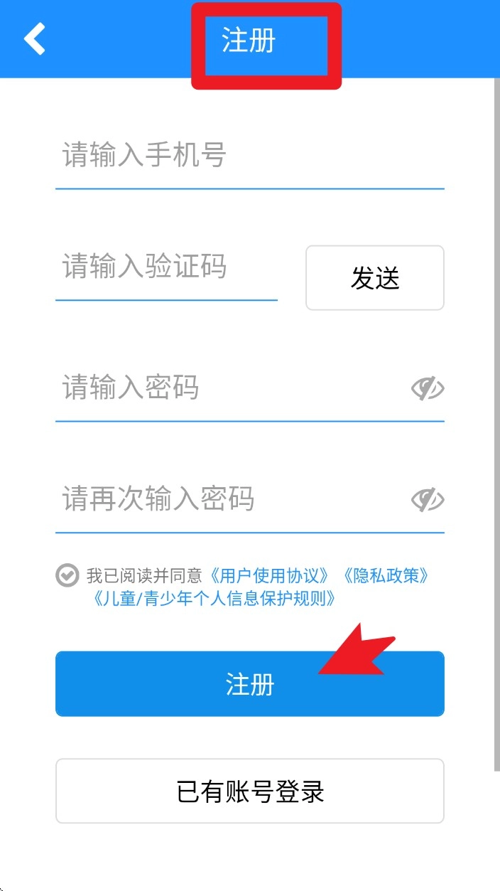1. 打开App,点击“注册”,依次填写手机号、验证码以及密码,勾选相关协议,再点击底部按钮,即可完成账号创建。