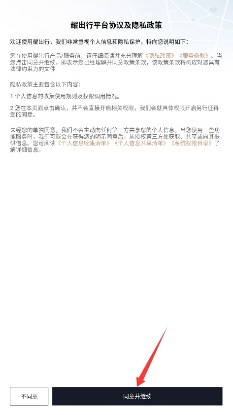 1、初次使用需阅读平台服务条款与隐私政策,确认后点击同意并继续进入应用。