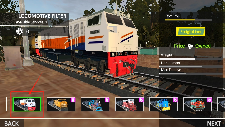 2、在机车选择界面,用红框选中喜欢的火车头,点NEXT确认选择。