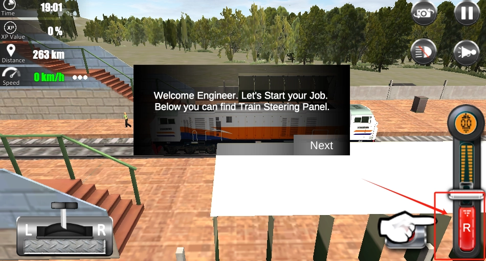 3、游戏开始后,看右下角红框里的操作面板,控制火车前进完成任务。