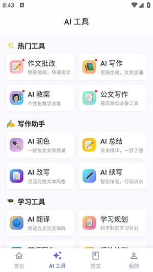 4、轻点“AI工具”选项板块,界面里呈现出作文批改、公文写作等诸多功能。