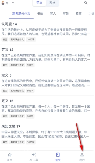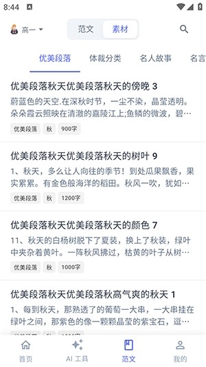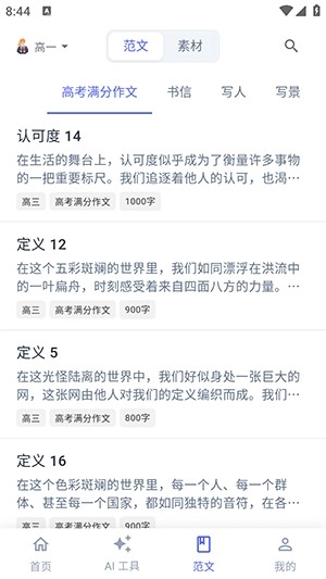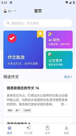 3、完成选择后,用户便能在无忧写作的首页上,看到多个功能板块以及各类精选作文。
