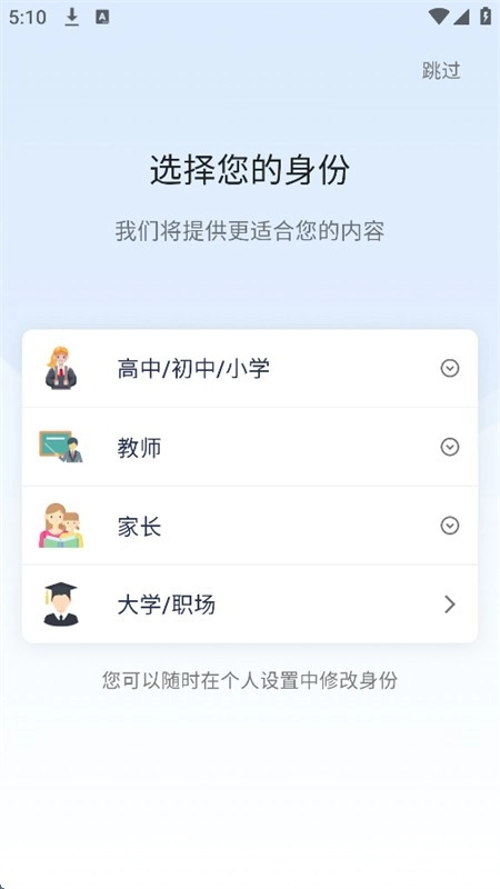 2、打开软件后,挑选您的身份,无忧写作的智能系统将为您呈现更契合您的内容。