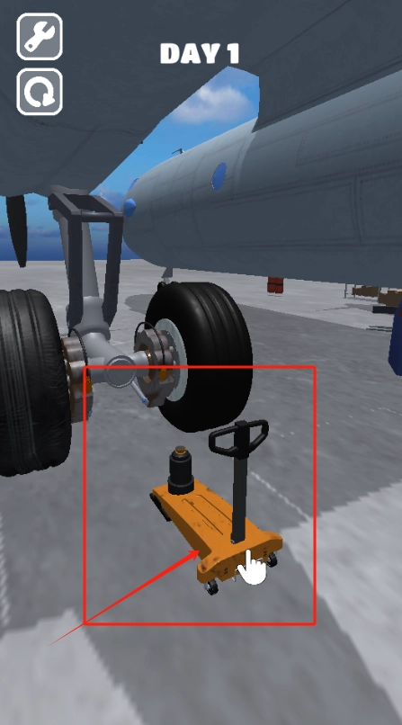 2、检查飞机起落架的两个大轮子,用旁边橙色推车运送工具,上方显示DAY1。