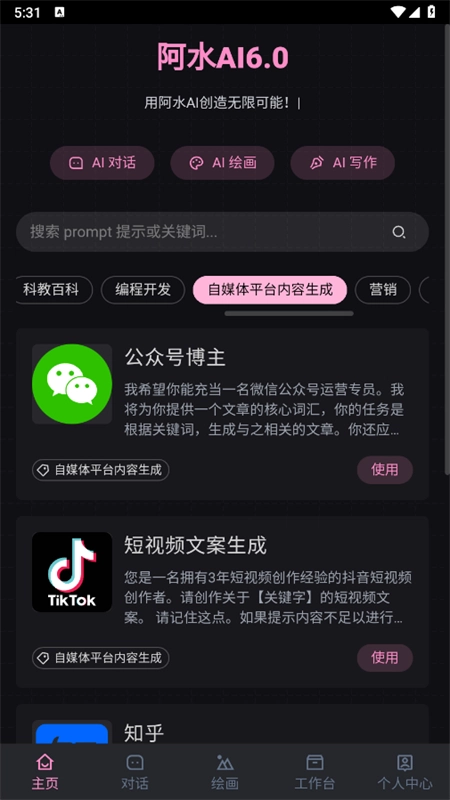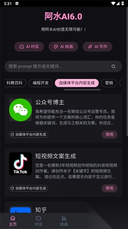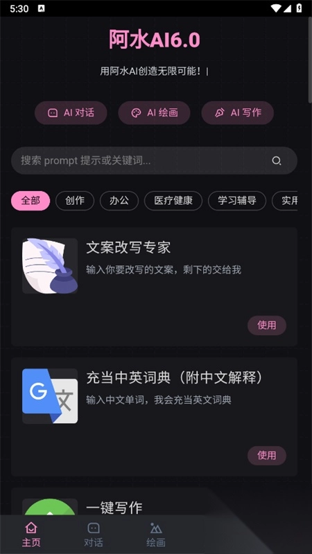 阿水AI作为一站式AI工具平台,功能极为强大。用户借助该软件,不仅能够实现AI绘画、AI写作、AI对话等多样化操作,还能依靠其解决日常各类问题,生成高质量文案。