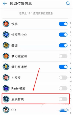 2、进入权限管理功能界面,从中选择读取位置信息的功能。在这个界面里找到启辰智联应用,把该应用的权限关闭,如此就能关闭软件的定位功能。