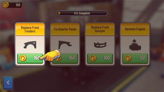 1、首先进入游戏中,我们就需要对一辆破旧的汽车进行改装,花费一定的金币购买新的部件。