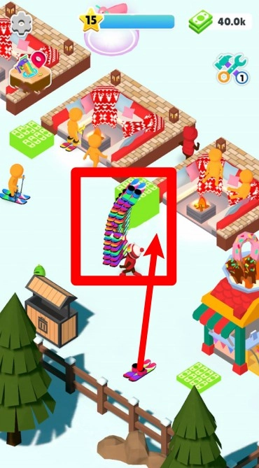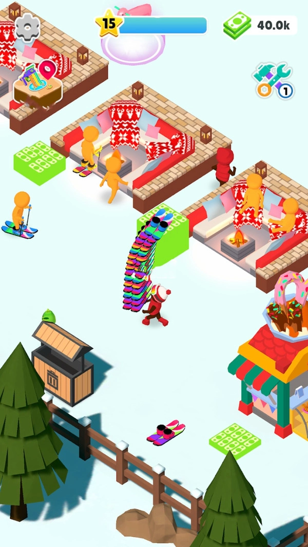 1.进入滑雪主题区,操作角色搬运滑雪板,为游客们提供滑雪体验。