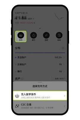 进入App首页后,点击【资产】-【充币】-【充入数字货币】,例如选择币种为【USDT】。