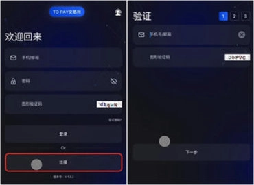 步骤1:打开TOPAY ,选择注册,输入正确的手机号或邮箱,填写图形验证码,点击“下一步”。