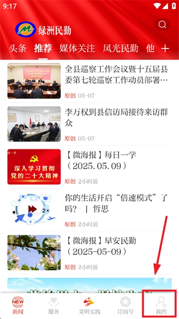 在本站下载并开启绿洲民勤,进入新闻主页面后点击“我的”。